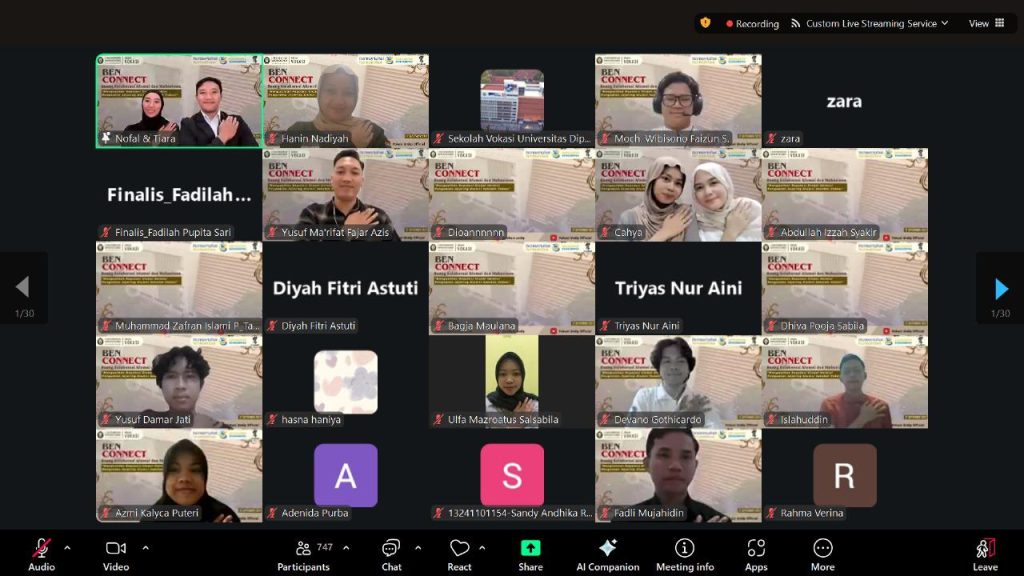 Semarang, 13 September 2025 – Sekolah Vokasi Universitas Diponegoro (Undip) menyelenggarakan BEN CONNECT, Ruang Kolaborasi Alumni dan Mahasiswa untuk Penguatan Jejaring Global, secara daring melalui Zoom Meeting. Acara ini menghadirkan Rektor Undip, Prof. Dr. Suharnomo, S.E., M.Si., Dekan Sekolah Vokasi Undip, Prof. Dr. Ir. Budiyono, M.Si., Direktur Reputasi, Kemitraan, dan Konektivitas Global Undip, Prof. Dr. Ir. Hadiyanto, S.T., M.Sc., IPU., serta Martanti Aji Pangestu, S.T., M.T., dosen PTRP Undip, sebagai moderator. Kegiatan yang diikuti oleh alumni, mahasiswa, dan civitas akademika untuk berbagi pengalaman serta membangun jejaring profesional ini dilaksanakan pada 12 September 2025.